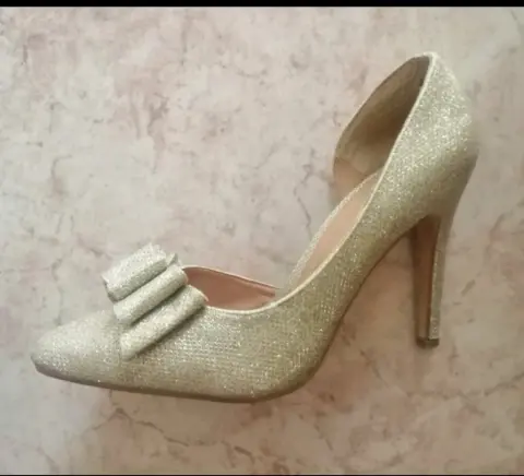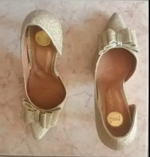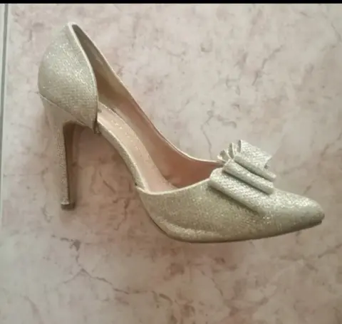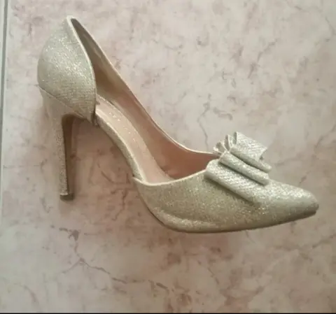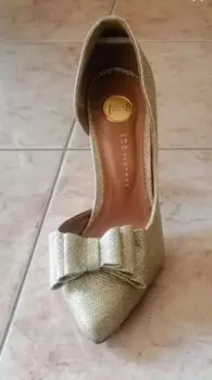 Zapatillas nuevas para una ocasión especial.Zapatillas tacón alto, dorado claro.Moño al frente.Con un diseño muy femininoModernas combinan con tu outfit de día o de noche