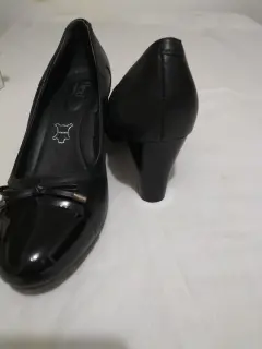 Zapatillas negras con charol en la parte frontal con un moño,corte vacuno plantilla borrego 6.5 de alto del tacón se uso una sola ocasión para cesión de fotos no fueron pisados en la calle