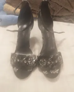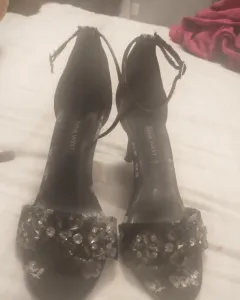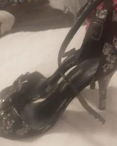Zapatillas floreadas. Color negro con flores bordadas en color plateado
