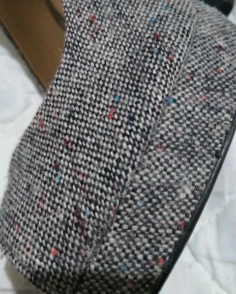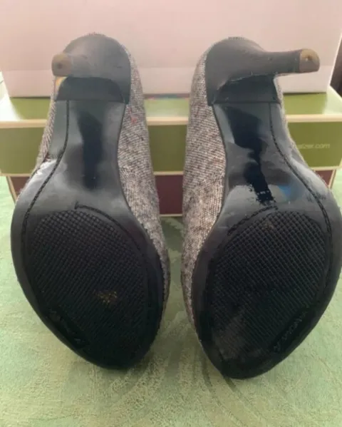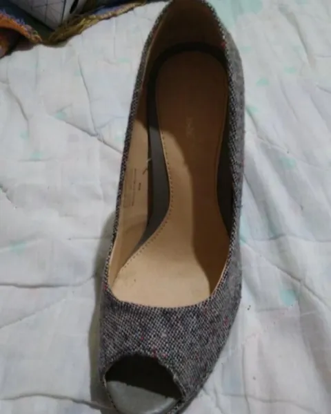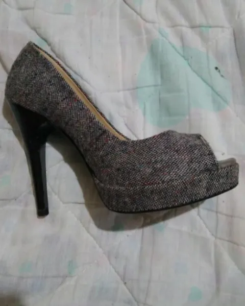 Zapatillas forradas de tela, tipo cuadritos grises, casi nada de uso, abiertas al frente.Tacon 11.5 cms