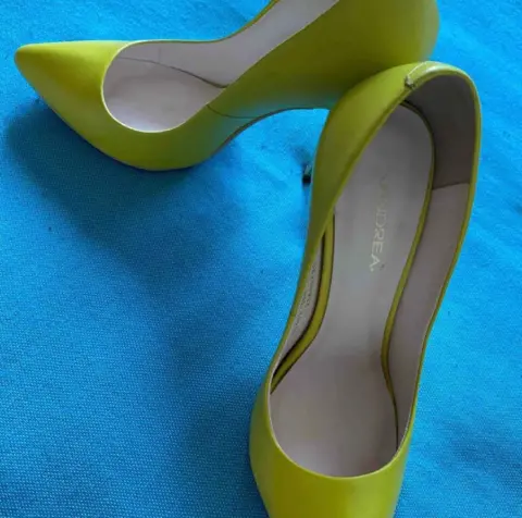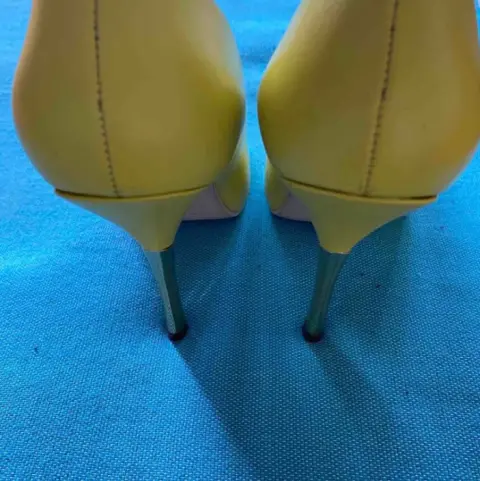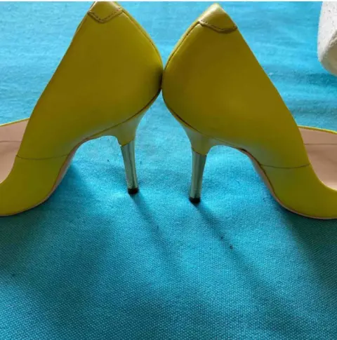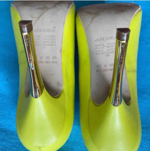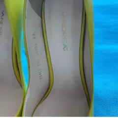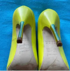 Super llamativas zapatillas color limón y tacon delgado y dorado, de la marca Andrea, tiene 10 cm de altura, el color es hermoso y muy vibrante.el tacon derecho tiene un pequeño raspón, pero es muy leve