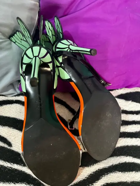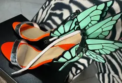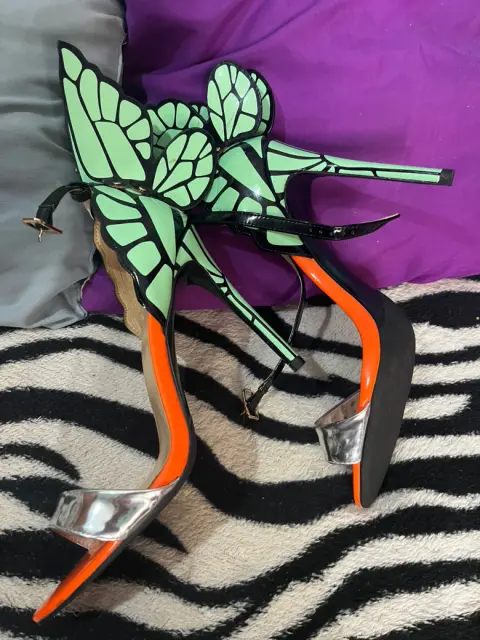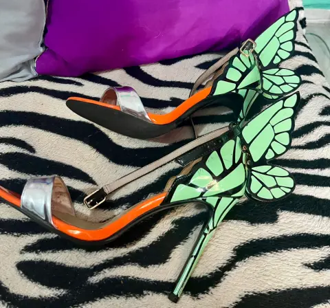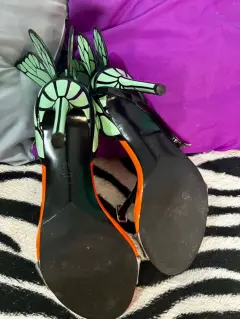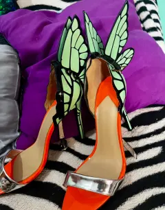Zapatillas Mariposas. Bellísimas zapatillas Europeas número 38 tacón 11 cms mariposa verde con naranja y plateado.Me las regalaron pero las vendo por que me quedaron un poco grandes solo las usé unas dos horas.