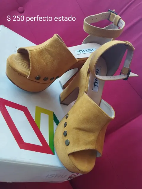 Talla # 24 mexicanos, color amarillo mostaza, semi nuevos, perfecto estado, tacón con plataforma, cómodos.