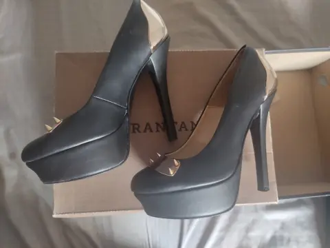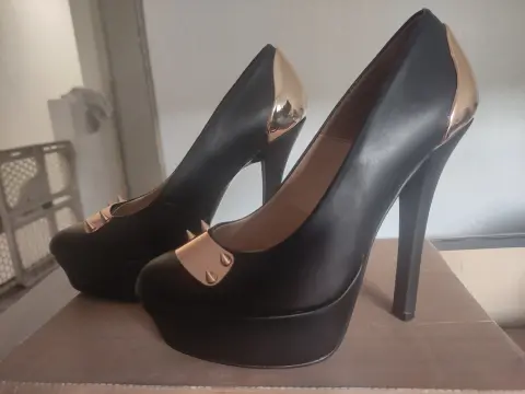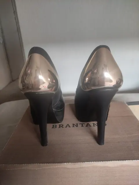 Zapatillas negras con detalles metálicos, marca Brantano. Tacón de 12 cm.