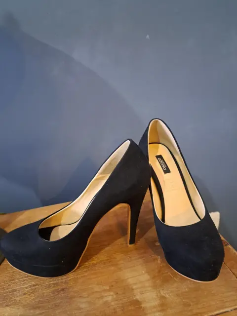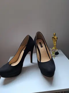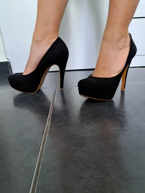 Zapatillas negras. Color negro, de gamuza, número 25, tacon 12cm. muy bonitos, una sola puesta