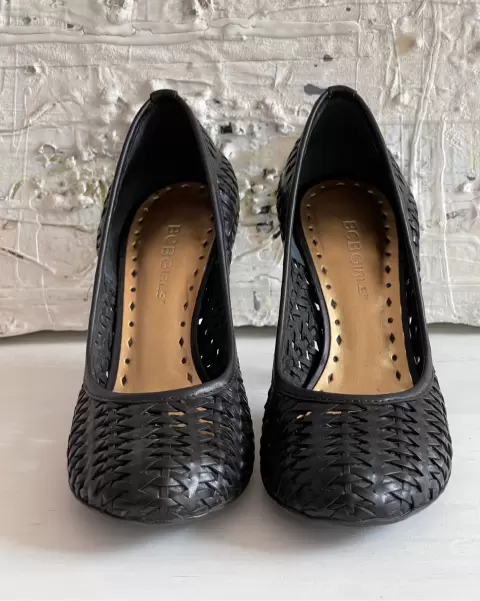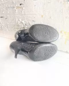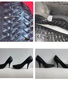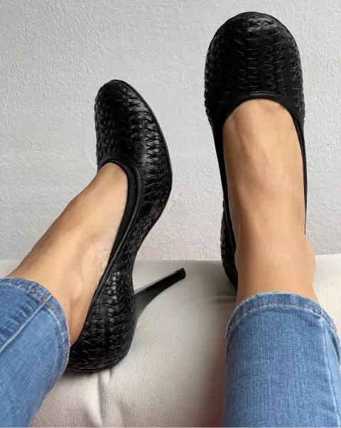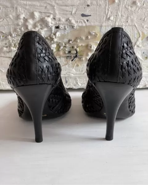 Zapatillas negras tejidas. Talla: 3 mexicano (6 americano)El tacón mide 10 cm.Zapatillas de piel tejidas y suela sintética negras.Detalle: en la punta por dentro se descarapeló en ambas zapatillas y en solo una se rompió un tejido. Ultima foto.