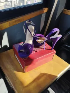 Zapatillas nuevas. Zapatillas color morado ,tacón de aguja, estilizadas, gamuza con detalle de plumas pequeñas.