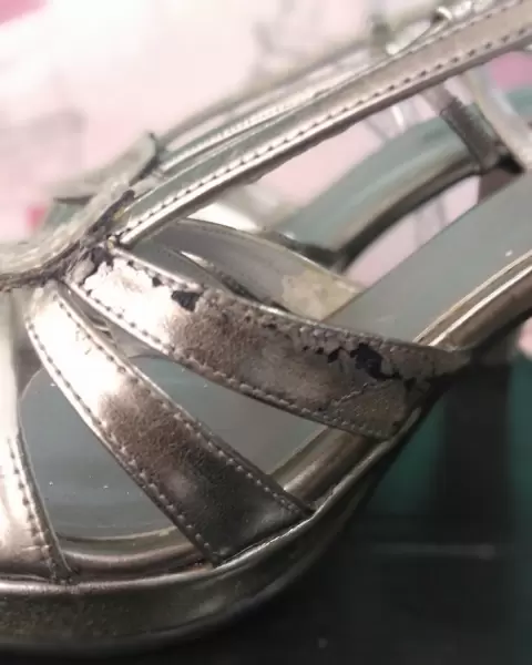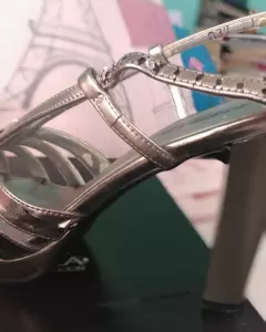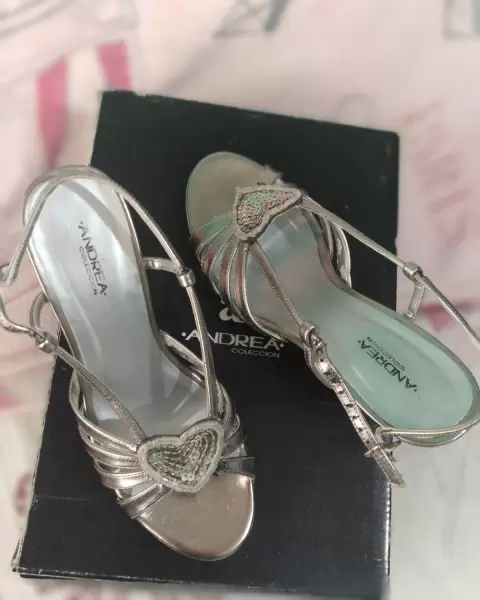 lindas zapatillas tipo sandalia toe. Con hermoso corazón de lentejuela. Color antimonio. Tacón 10 cm. Talla 23. Queda perfecto a la 22.5. Tiene detalles de que se ha desprendido el color plateado, sin embargo, no es por el uso, sino por estar guardadas en el clóset. Se les aplicó una base de barnizado para su protección.