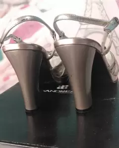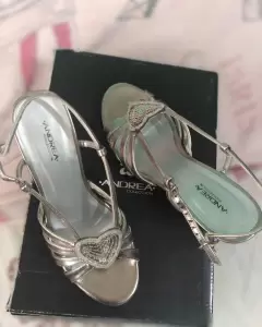 Zapatillas plateadas elegantes con corazón.. lindas zapatillas tipo sandalia toe. Con hermoso corazón de lentejuela. Color antimonio. Tacón 10 cm. Talla 23. Queda perfecto a la 22.5. Tiene detalles de que se ha desprendido el color plateado, sin embargo, no es por el uso, sino por estar guardadas en el clóset. Se les aplicó una base de barnizado para su protección.