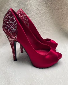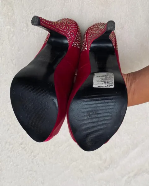 Zapatillas rojas con brillos. Zapatillas rojas como quemado o vino, no sé exactamente tienen un de rojo hermoso.Me las puse 3 veces , están en buen estado como se ven en la foto, revísale puntas, tacón, suela, por dentro, me gusta ser sincera... Tacón de 14 cm.