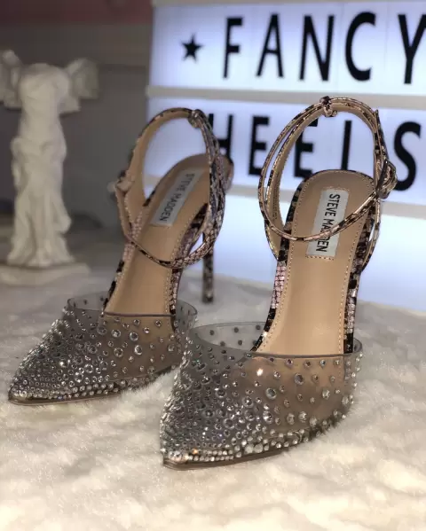 Zapatillas Steve Madden, con detalles en pedrería imitación diamante y animal print víbora rosa. Talla 5Mx. Tacón tamaño 12cm.