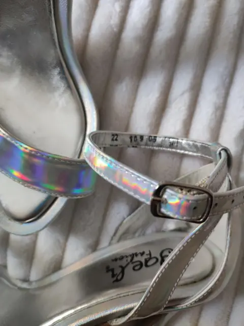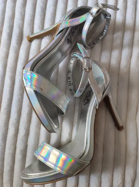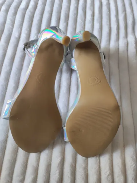 Zapatillas tacón delgado Color plateado tornasol (cambia con la luz)Detalle en la impresión (no se nota)