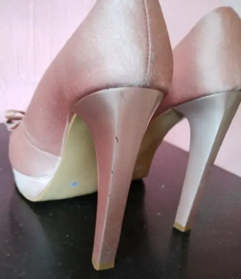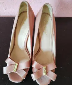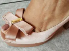 Zapatillas forradas, el color de la tela es parecido a rosa gold, tienen detalles de uso en el tacón que se muestran en la foto