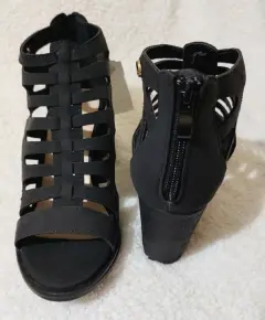 Hermosa zapatilla color Negra de material resistente al agua, diseño elegante perforado con cierre atrás, estilo tiras romanas, suela antiderrapante, altura tacón de 8cm. México Número #25.5cm. Pregúntame o visita mi closet para más modelos y numeración. En tu primer compra dentro de la app se te descuenta -$ usa mi código Promocional Copia y pega: lucyrmxXqQJ9