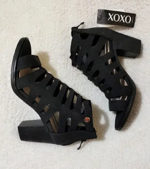 Zapatillas Xoxo negras. Hermosa zapatilla color Negra de material resistente al agua, diseño elegante perforado con cierre atrás, estilo tiras romanas, suela antiderrapante, altura tacón de 8cm. México Número #25.5cm. Pregúntame o visita mi closet para más modelos y numeración. En tu primer compra dentro de la app se te descuenta -$ usa mi código Promocional Copia y pega: lucyrmxXqQJ9