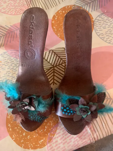 Zapato. Zapato de mujer con tacón de aguja, abierto tipo sandalia la suela café y el adorno es una flor