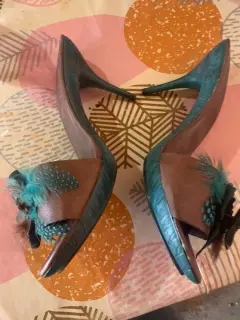 Zapato de mujer con tacón de aguja, abierto tipo sandalia la suela café y el adorno es una flor