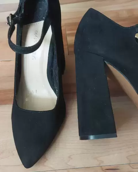 Zapatos negros de ante, tacón geométrico. Practicamente nuevos.Con hebilla pequeña color dorado.