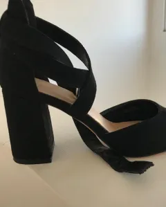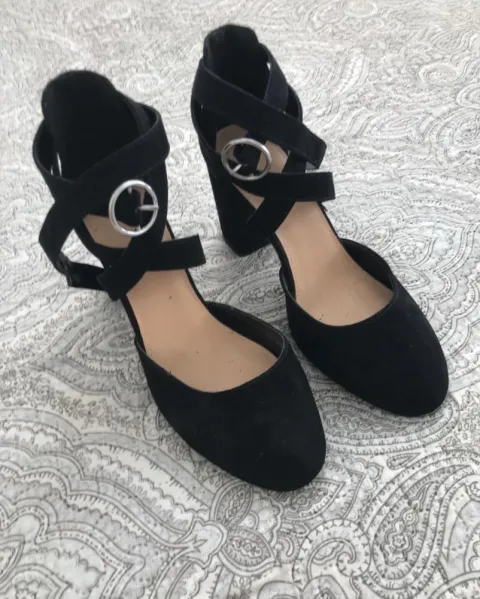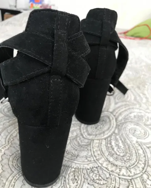 Sencillos, cómodos y elegantes. Color negro, se cierran en el tobillo. El tacón mide 8cm alto y 4.5 ancho. Por la humedad el reverso de una correa está descarapelada.Muy bonitos!!