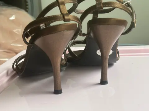 Zapatos en buen estado , talla 4 , con pedrería discreta , material satinado café. Con tacón de 7 cm aproximadamente . Marca. Westies.