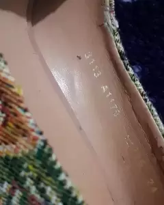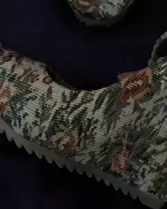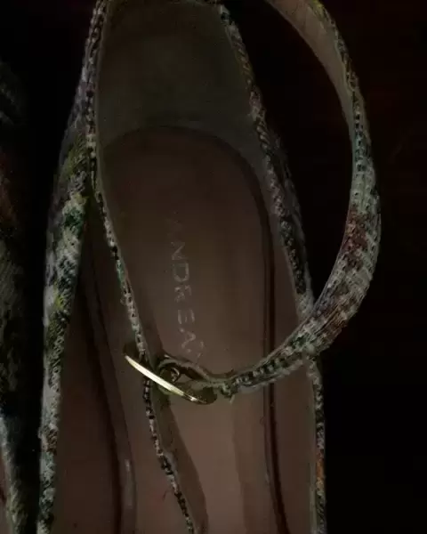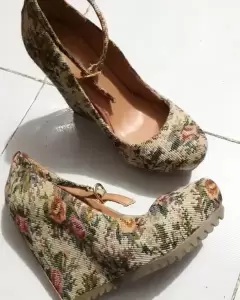 Zapatos cerrados Andrea color beige estampado con flores de pulsera en tobillo, 11 cm de alto con plataforma y suela de goma por lo cual son muy cómodos. Como detalle por dentro se ha dañado la pielecita