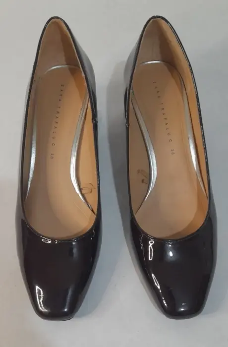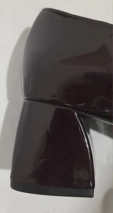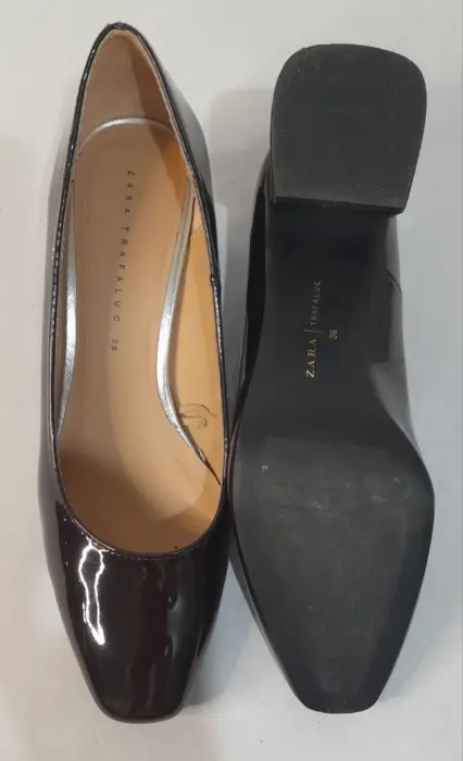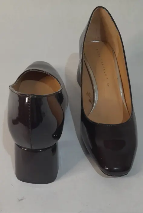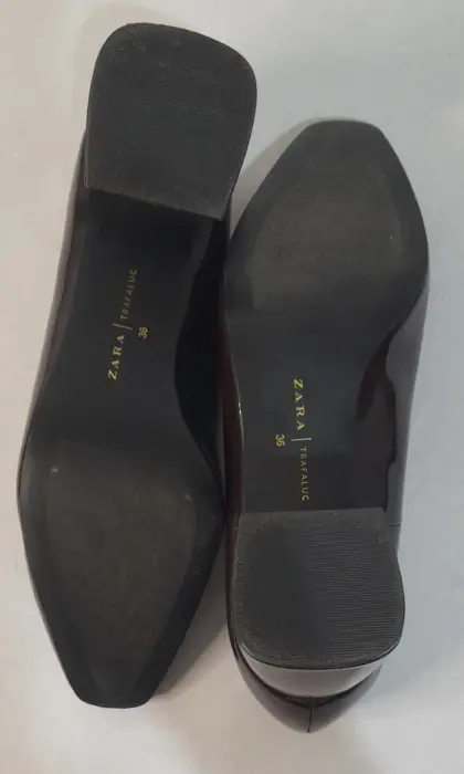 ZARA zapatos de tacón para dama SEMINUEVOS. Zapato para dama, SEMINUEVO, marca ZARA TRAFALUC, número 23.5, color berenjena, corte tipo charol sintético y forro sintético, el tacón mide 5 cm y es cuadrado, el zapato izquierdo tiene pequeños raspones, casi imperceptibles.