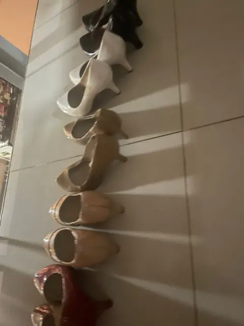 5 pares de zapatos de charol de color: rojo, blanco, negro, nude, y rosa. Tacón 6 ideal para oficina talla 23.5