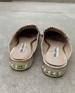 Mules en tono dorado pálido, con aplicaciones de perlas. Son talla 4 y vienen un poco anchos, quedan muy cómodos para pie gordito. Les falta una perlita en un tacón y tienen un poco de desgaste en la plantilla por dentro.