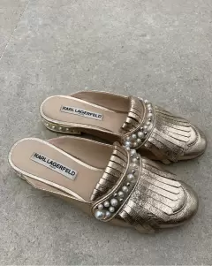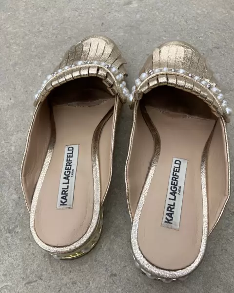 Mules dorados Karl Lagerfeld. Mules en tono dorado pálido, con aplicaciones de perlas. Son talla 4 y vienen un poco anchos, quedan muy cómodos para pie gordito. Les falta una perlita en un tacón y tienen un poco de desgaste en la plantilla por dentro.
