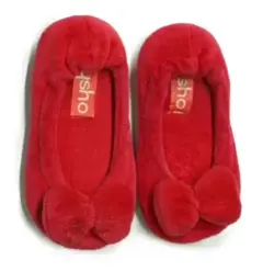Pantuflas rojas con moño al frente talla 14 cms de largo, la esquina de un moño está un poco sucio y en la planta está un poco sucias mínimo pero no las quiero lavar por que son nuevas