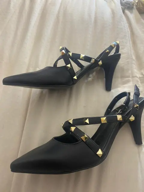 Tacón pequeño, negros, estoperoles dorados, número 3.5 mx, con correa en talón y completamente nuevos.