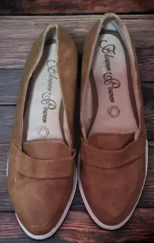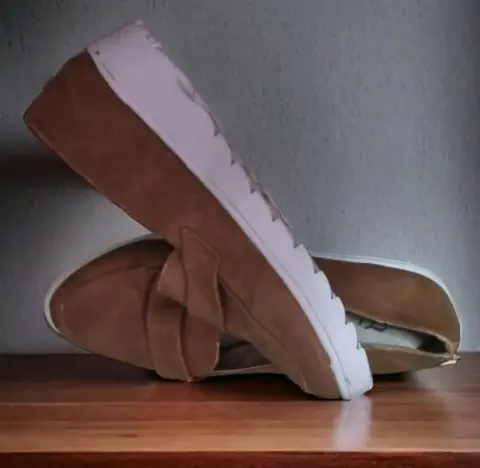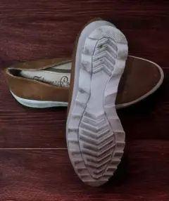 Zapatillas bajas tipo gamuza color cafe, cuentan con un detalleen la parte del talon, pero estan en buen estado.