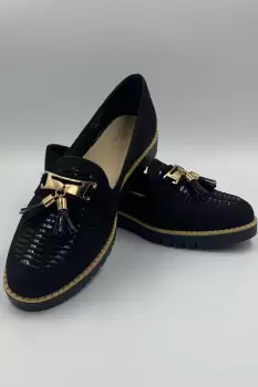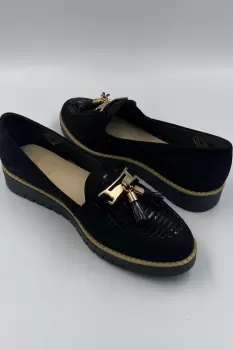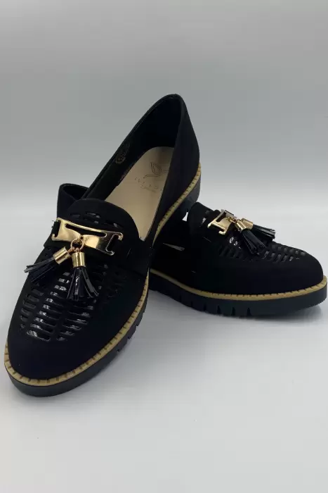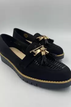 ZAPATO CASUAL DAMA. Su diseño en color negro tipo durazno cuenta con un detalle en dorado en la parte de arriba para darles estilo y textura, también tienen una suela tr que ayuda a que sean muy cómodos para poder usarlos todos los días sin problemas. Están fabricados con materiales sintéticos que los hacen muy ligeros.