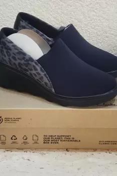 Zapatos Clarks Mazy Seabury. Este estilo versátil presenta una parte superior de corte bajo construida con cuero y tela flexible que facilita el calce. Su tacón de cuña y su suela de EVA liviana brindan potencia para caminar en todos los sentidos y sus características Ultimate Comfort incluyen una plantilla Ortholite® que absorbe los impactos. Nuevos sin uso.