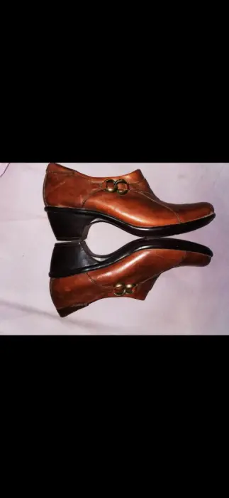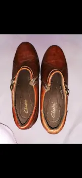 Zapatos marca Clarks estilo mocasín de Dama con cierre en la lateral del empeine por dentro son acolchonados son número cuatro tengo en color café, el cierre lateral se abre y tienen decoración en el empeine también de una hebillaUtilizados en una ocasión