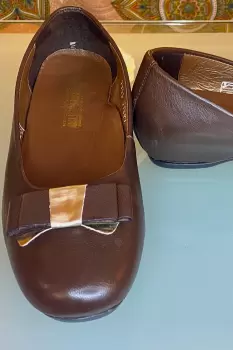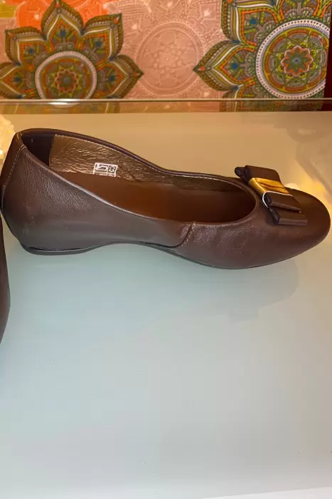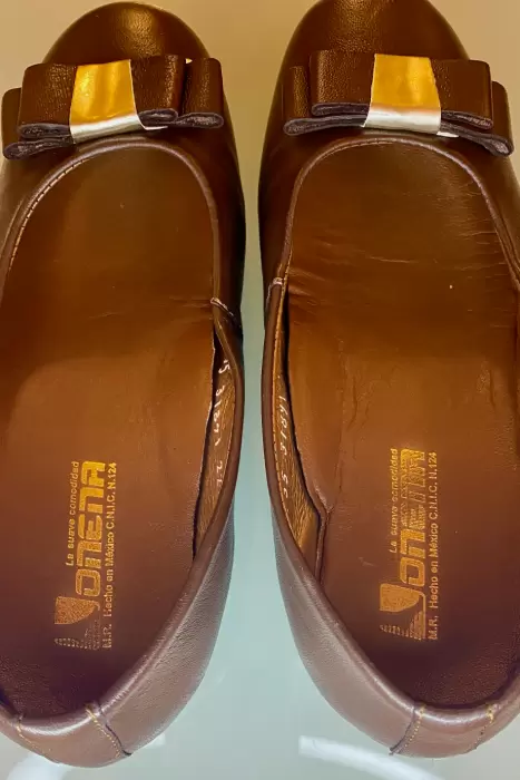 Zapatos Onena 7755 Café Con Moño. Forro de piel, plantilla acojinadaTiene tacón interno de 3 centímetrosAl frente tiene un moño de piel del mismo color con un remate en sintético que simula metal doradoEstán en bueno estado, no raspados
