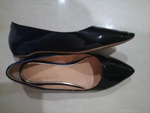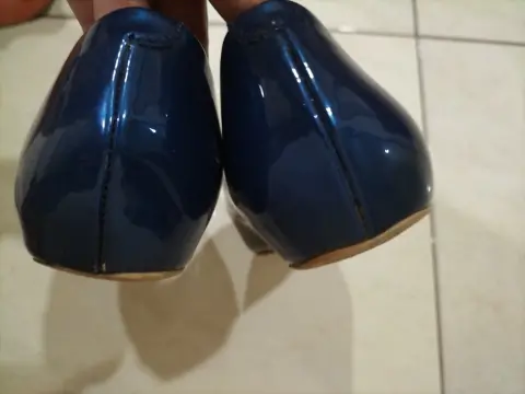 Zapatos planos, usados, de charol, color azul marino,número 24 1/2. Un poco raspados de la punta.