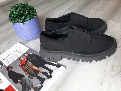 Zapato casual de ante color negro, estilo Derby. De suela gruesa antiderrapante. Ideal para moda urbana. Cómodo y muy combinable.