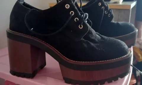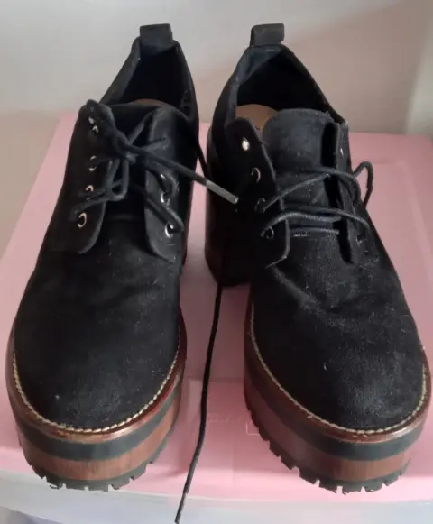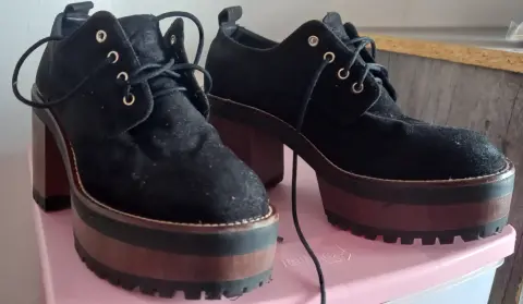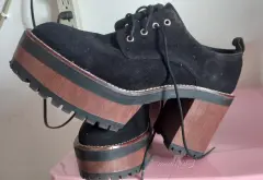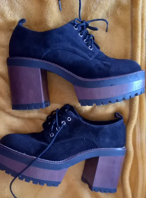 Zapatos de cintas con plataforma vintage. Zapatos de moda tipo vintage de gamusa negra, cintas al frente y plataforma super comoda antiderrapante en color cafe madera combinable para un super autfit