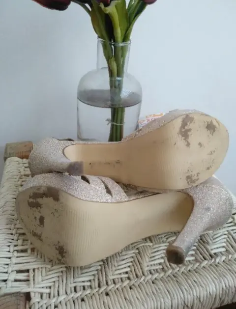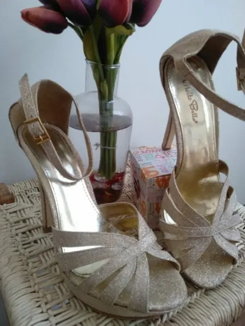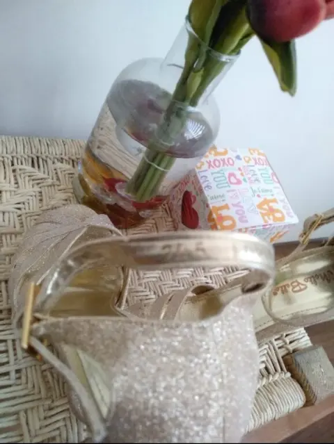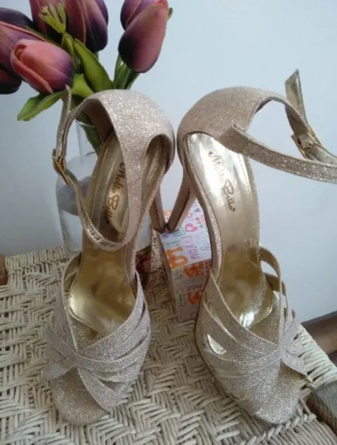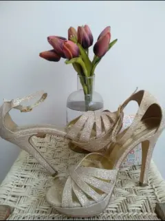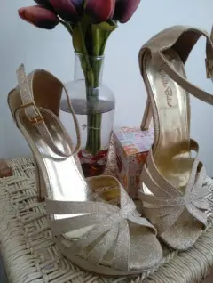 Sandalias de tacon 12 cm, doradas con brillitos, comodas y elegantes, perfectas para bailar toda la noche