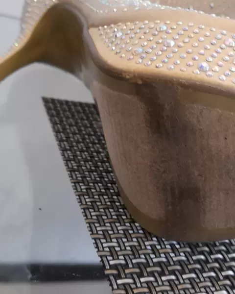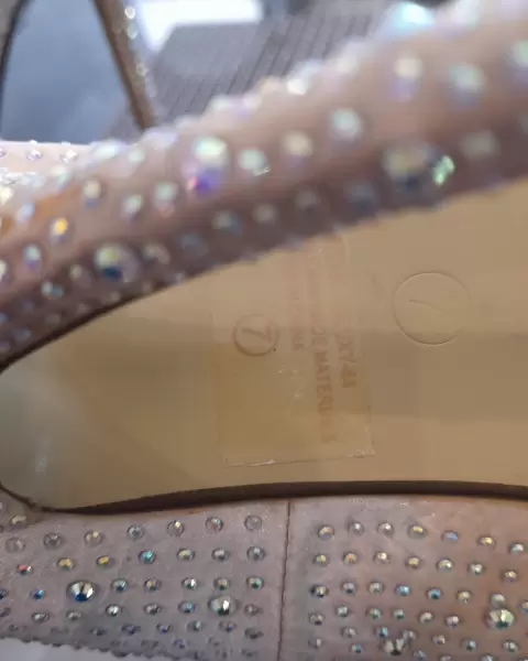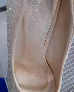 Lucen hermosos, tacon de 12 cm. Con su plataforma. No les falta ninguna piedra. Color más beige que blanco.Comprados en El Paso TX. En Ross.