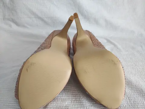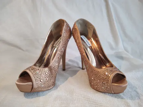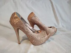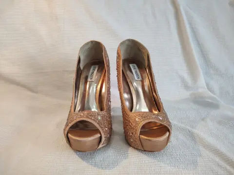 TACONES STEVE MADDEN #7 BOCA PESCADO. Tacones Steven Madden #7 mex horma ancha originales, color cobre. Tacón de 15 CM aprox y plataforma en su parte más alta de 4 cm.con acabado de piedra fina. Boca de pescado.Se utilizaron una sola vez como puede verse en la foto la suela, no le falta ni una piedra todo sin detalles hermosísimas para un evento de gala. Nota: Se entréga en caja genérica.