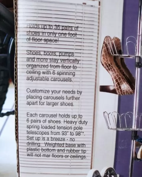 ¡Sostiene hasta 36 pares de zapatos en solo un pie de espacio en el piso!Los zapatos, las botas, los zapatos de tacón y más se mantienen organizados verticalmente desde el piso hasta el techo con 6 carruseles giratorios ajustables.Personalice sus necesidades colocando carruseles más separados para zapatos más grandes.Cada carrusel tiene capacidad para 6 pares de zapatos.