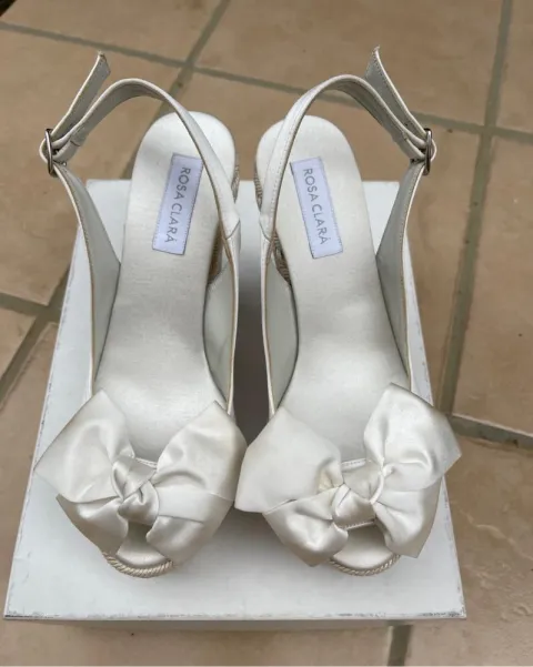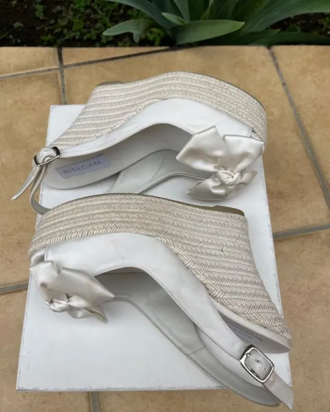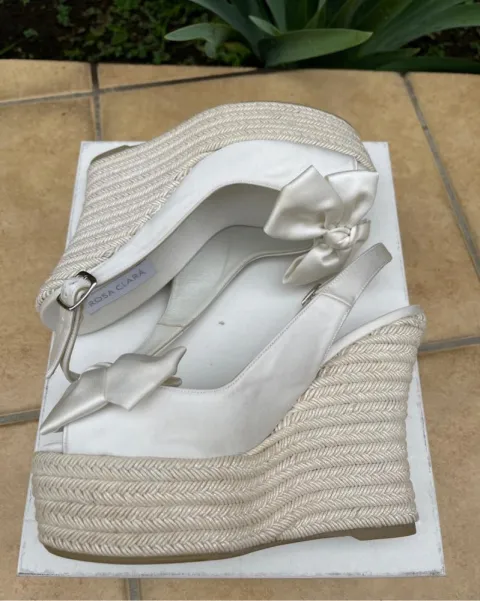 Zapatilla de raso beige Rosa Clará. Talla: 37 IMPORTANTE: miden 23.5 cm, color beige claro, 12.5 cm de alto. Tienen ciertas manchas pequeñas. Se envían con la caja original.