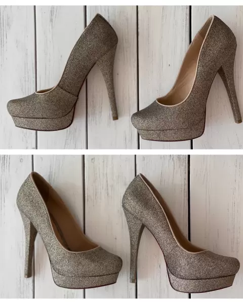 Zapatillas con plataforma color dorado (aunque trae combinación de colores) son muy prácticas y sirven casi con cualquier color.Talla: 23 (6 americano)Como referencia soy 3.5 y me quedan perfectos.El tacón mide 14 cm con todo y plataforma.Son zapatillas que han tenido uso, las conservo en buen estado y tienen detalles que se pueden apreciar en las fotos. Son detalles estéticos, no funcionales
