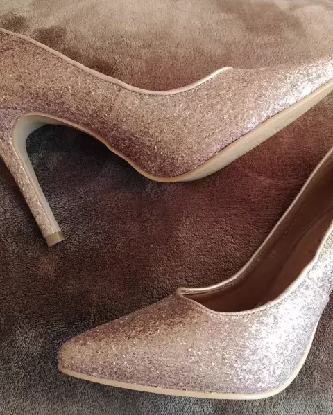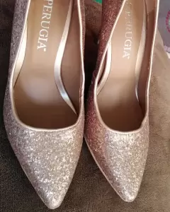 Zapatillas de pico color cobre de diamantina de palillos, sin plataforma tacón delgado del número 11, solo tienen una puesta tienen un pequeño detalle interno pero no afecta la estética del calzado solo han estado guardadas.