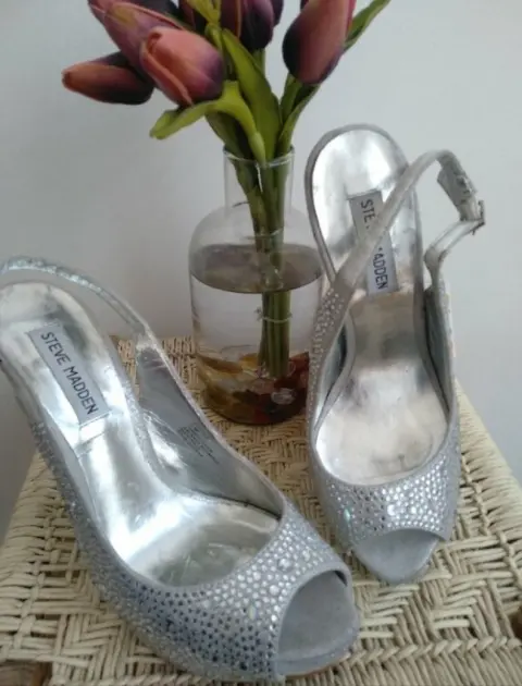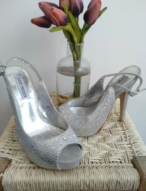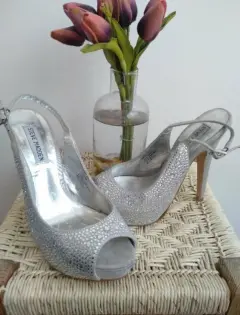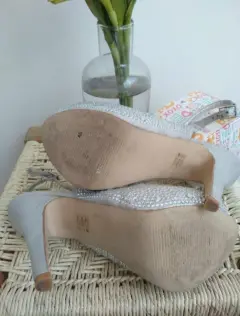 Hernosas sandalias de tacón 13 cm, plateados con pedreria, comodas y elegantes. Brillaras en la fiesta .