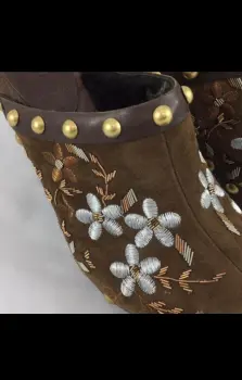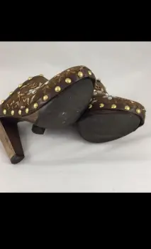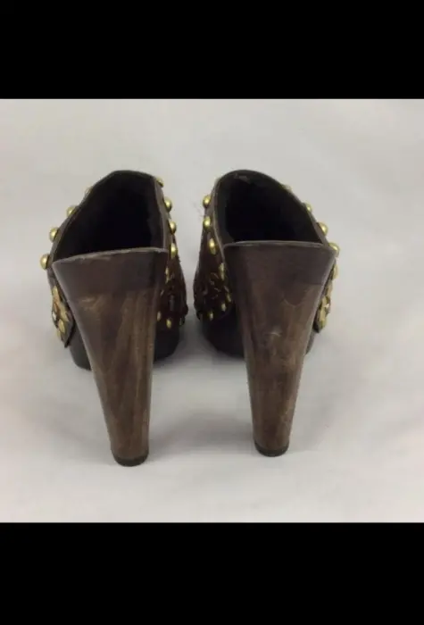 Zuecos MIU MIU. Zuecos únicos de Miu Miu. Ante marrón con bordado floral y tachuelas en tono latón. Tacón de madera de 4". Plataforma de 3/4". Mule tipo zueco. Forro de borrego suave. Hecho en Italia. Talla 36